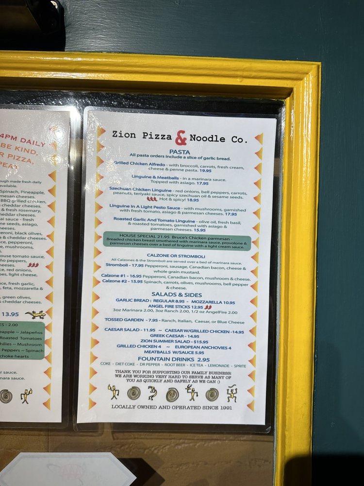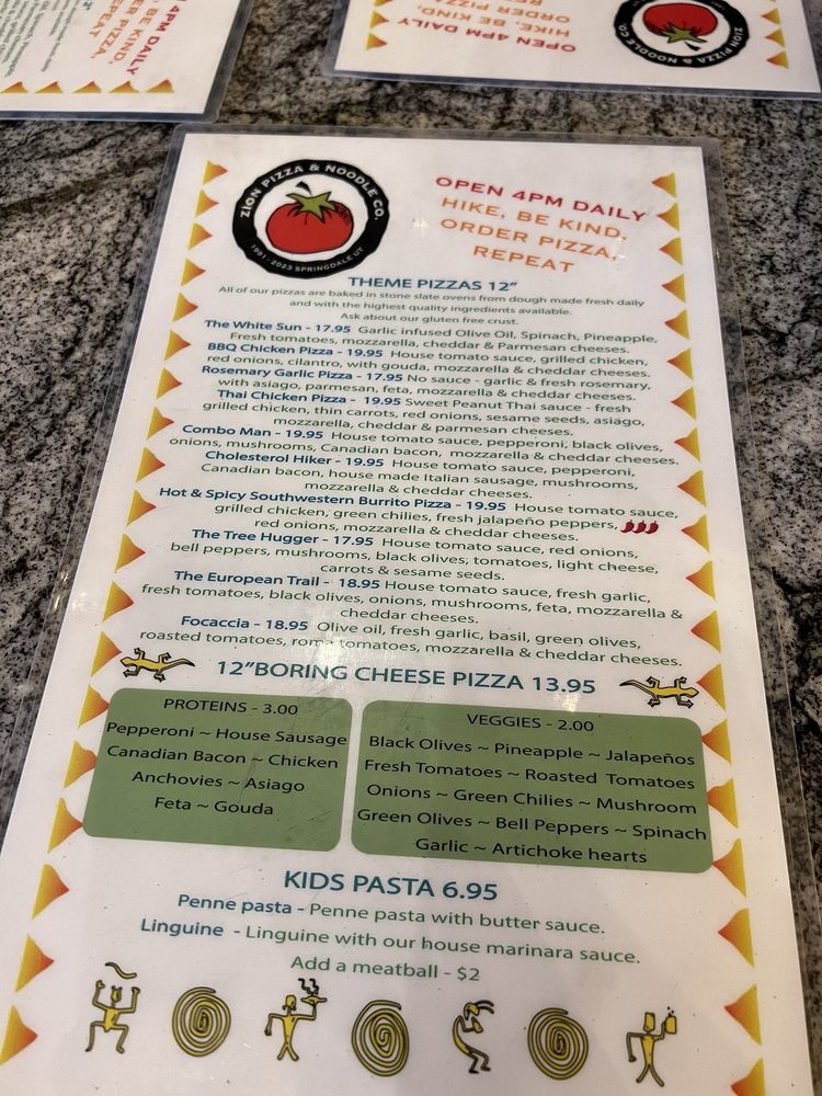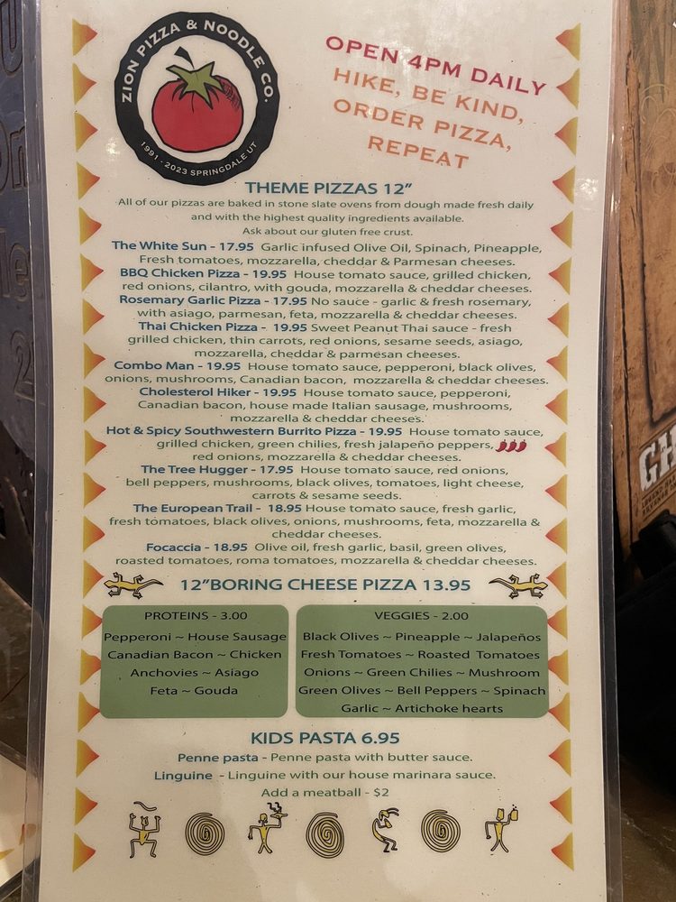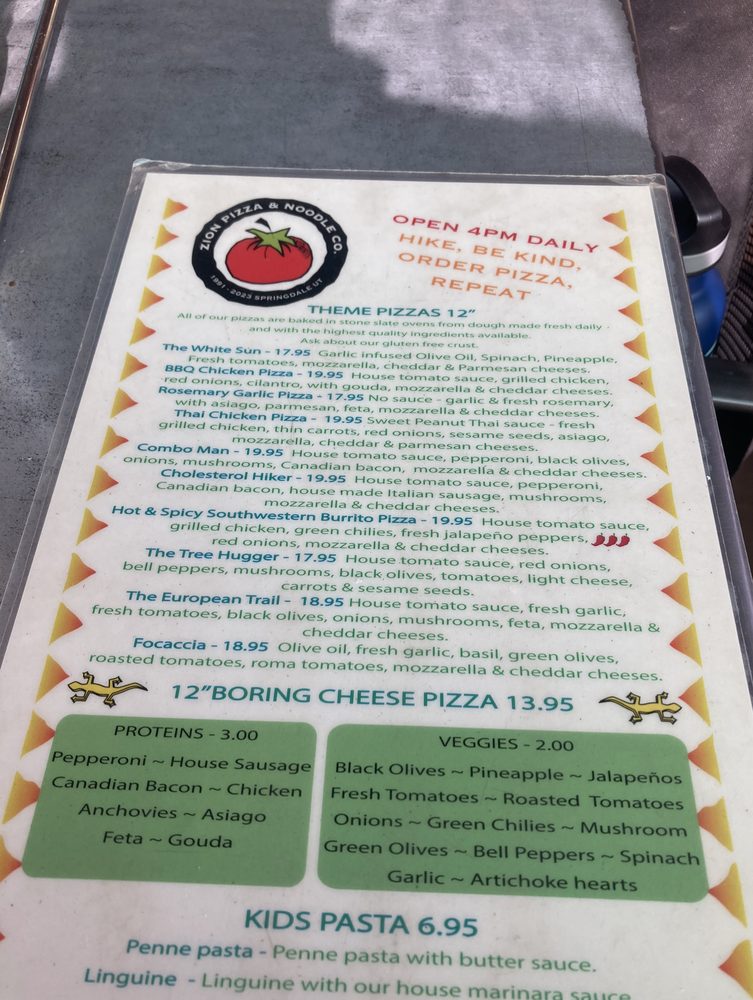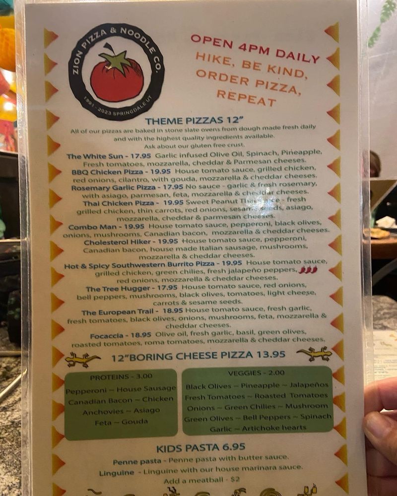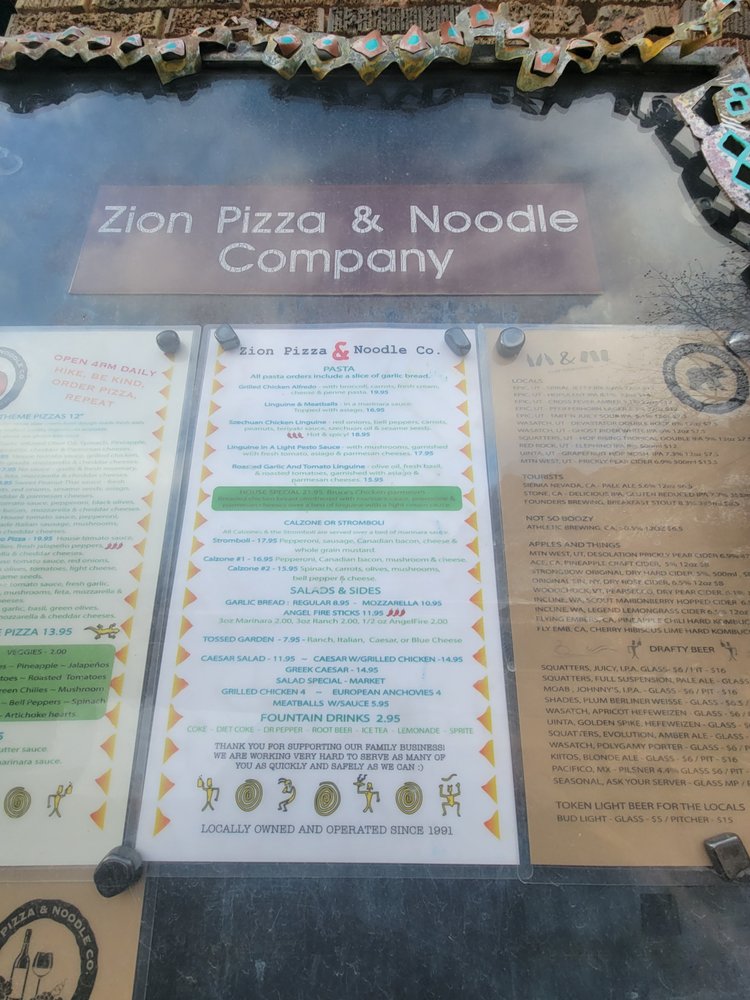 Zion Pizza & Noodle, located in Springdale, UT, is a beer garden offering delicious pizza and salad options. The menu includes unique pizza creations like Thai Chicken Pizza and BBQ Chicken Pizza, both highly recommended by customers. The pizzas are known for their crispy crust and generous cheese toppings, creating a delightful dining experience. The restaurant provides a casual atmosphere with outdoor seating and friendly service. Customers praise the flavorful and perfectly cooked pizzas, with some describing them as the best they've ever had. With vegan options, wheelchair accessibility, and various amenities like outdoor seating and free Wi-Fi, Zion Pizza & Noodle caters to a diverse range of diners. If you're looking for a memorable dining experience with great pizza and a stunning view, Zion Pizza & Noodle is a must-visit spot.