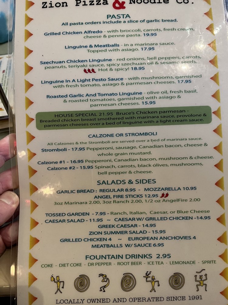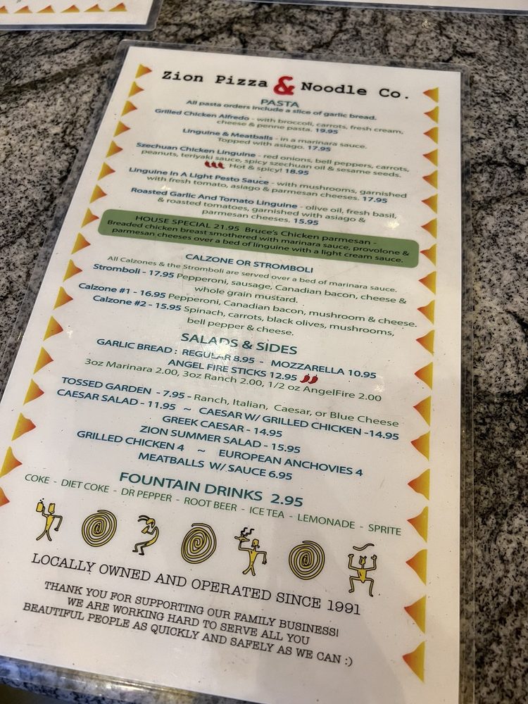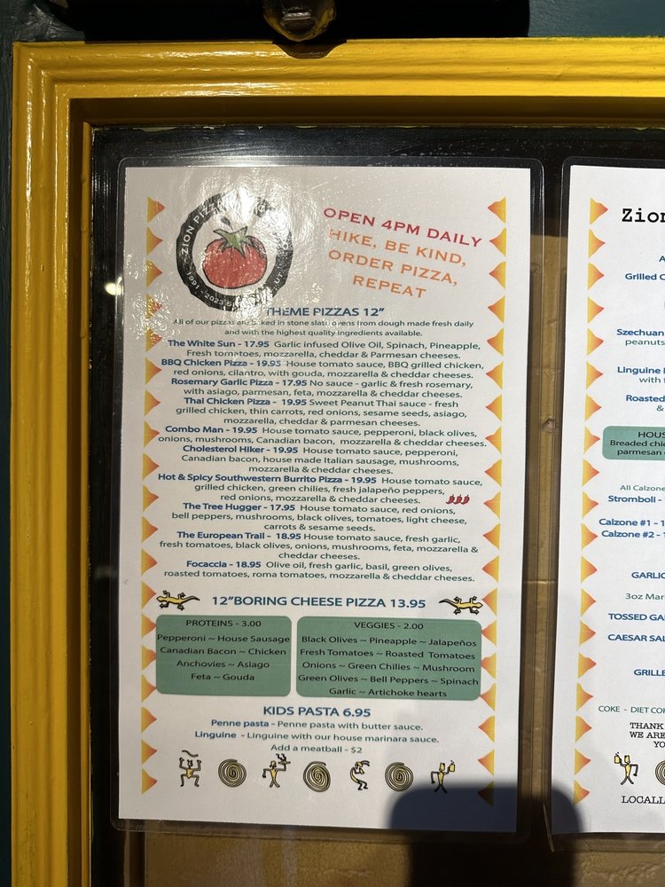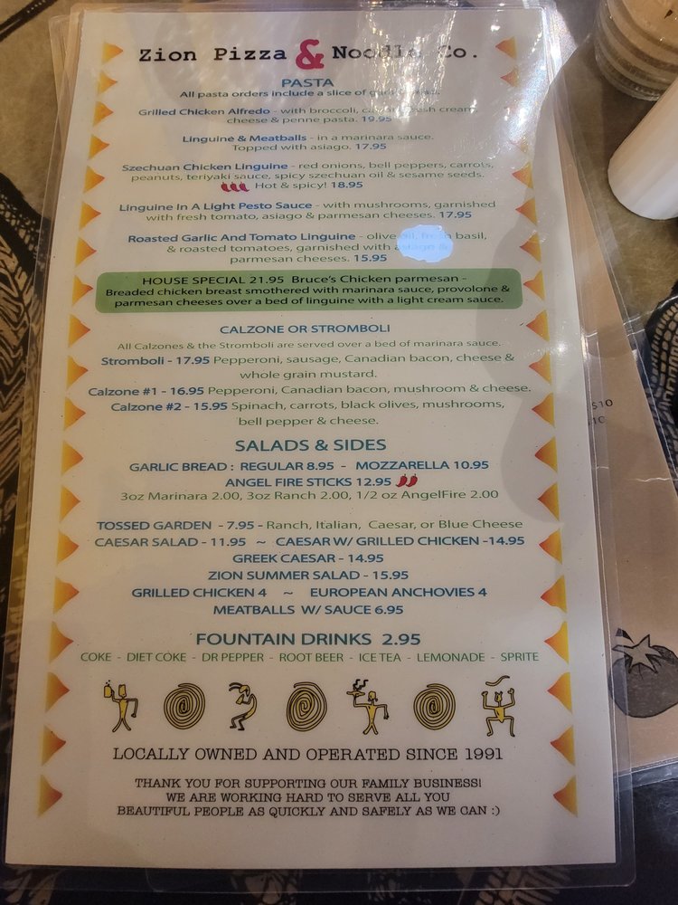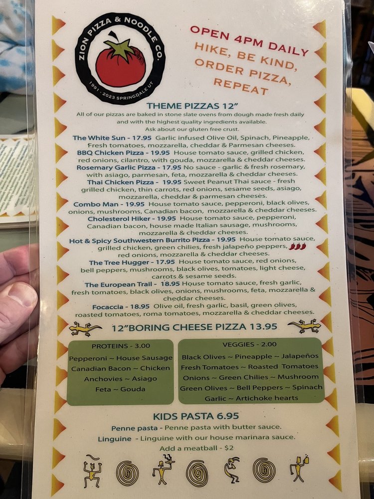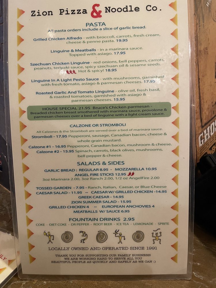 Zion Pizza & Noodle, located in Springdale, UT, is a beer garden offering delicious pizza and salad options. The menu includes unique pizza creations like Thai Chicken Pizza and BBQ Chicken Pizza, both highly recommended by customers. The pizzas are known for their crispy crust and generous cheese toppings, creating a delightful dining experience. The restaurant provides a casual atmosphere with outdoor seating and friendly service. Customers praise the flavorful and perfectly cooked pizzas, with some describing them as the best they've ever had. With vegan options, wheelchair accessibility, and various amenities like outdoor seating and free Wi-Fi, Zion Pizza & Noodle caters to a diverse range of diners. If you're looking for a memorable dining experience with great pizza and a stunning view, Zion Pizza & Noodle is a must-visit spot.